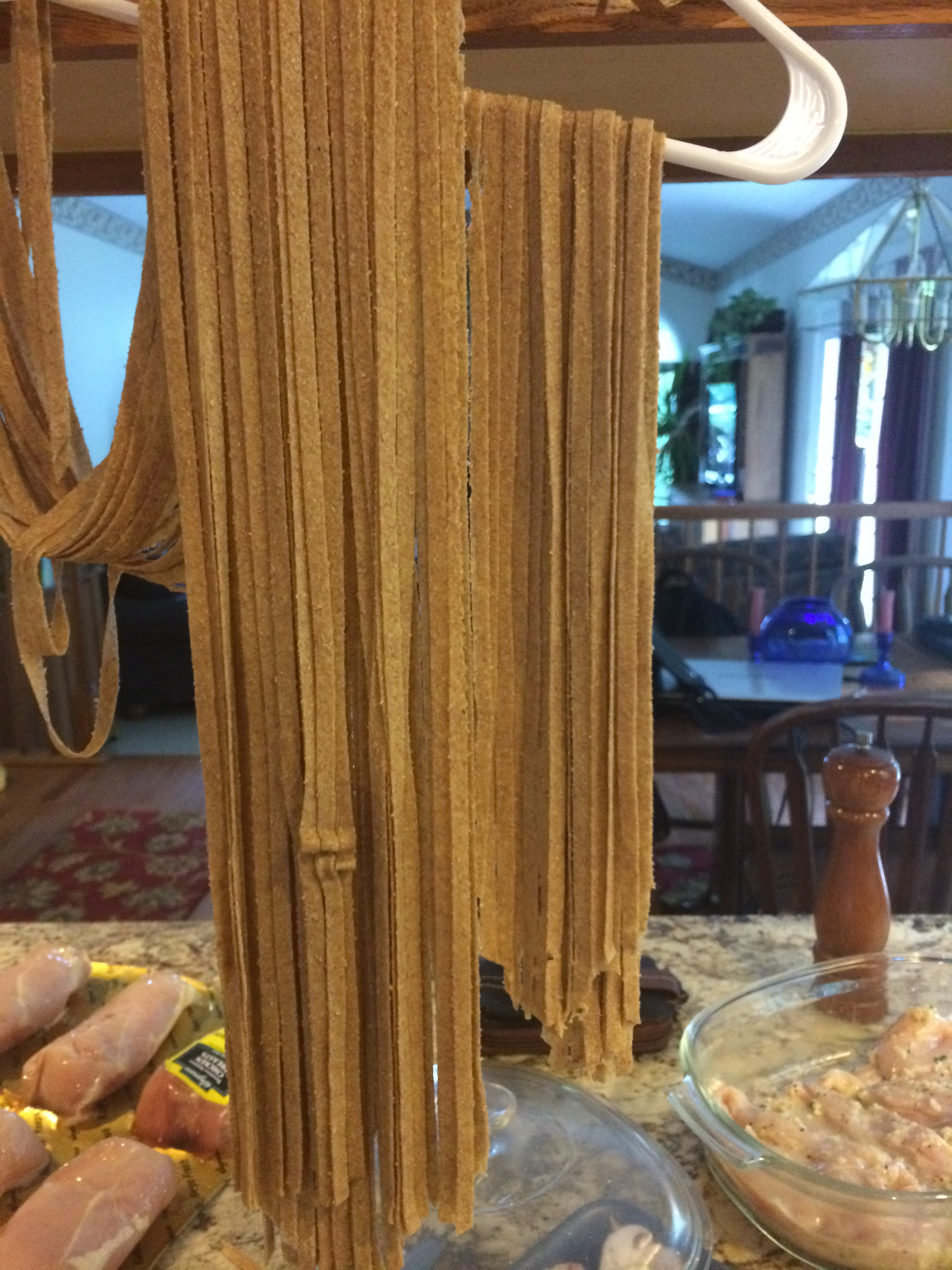 Like I said, very simple. Virtually only three ingredients needed. Combine these ingredients and follow the KitchenAid instructions manual to feed the dough into fettuccini strips. If you don’t have a KitchenAid pasta attachment, no worries. Simply roll the dough out very thin and cut the pasta into thin strips. Hang the pasta to dry for a little bit after it is cut. I hung mine for about 5 minutes (on a coat hanger!)