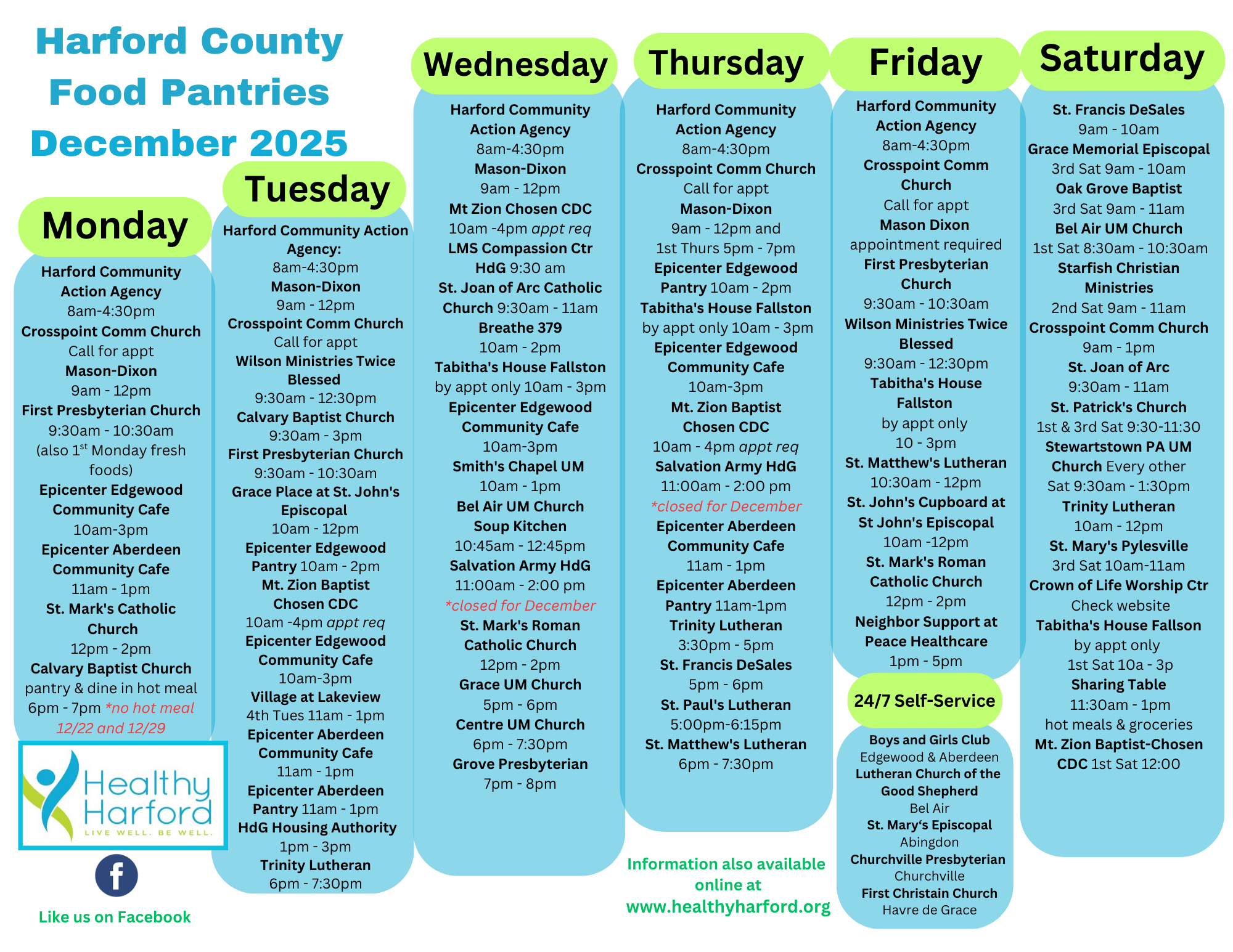 Food insecurity is a major concern in our community, and the lack of access to healthy foods directly impacts the health and wellbeing of our Harford County neighbors. There are resources available, however, and we are working hard to provide a one stop resource for food assistance in our community. We will be updating these pages regularly, but if there a resource you would like to see included, please reach out to us on Facebook!